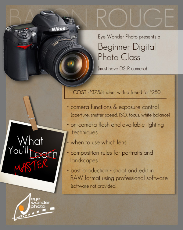 Aaron Hogan, owner of Eye Wander Photo in Baton Rouge is holding basic (beginners) digital photography classes on the dates written below from January 2-16, 2013, from 5:30-8:30 pm. There will be 3 regular weekday evening classes and one Rural Life Museum field trip on Sunday, January 19, 2014.